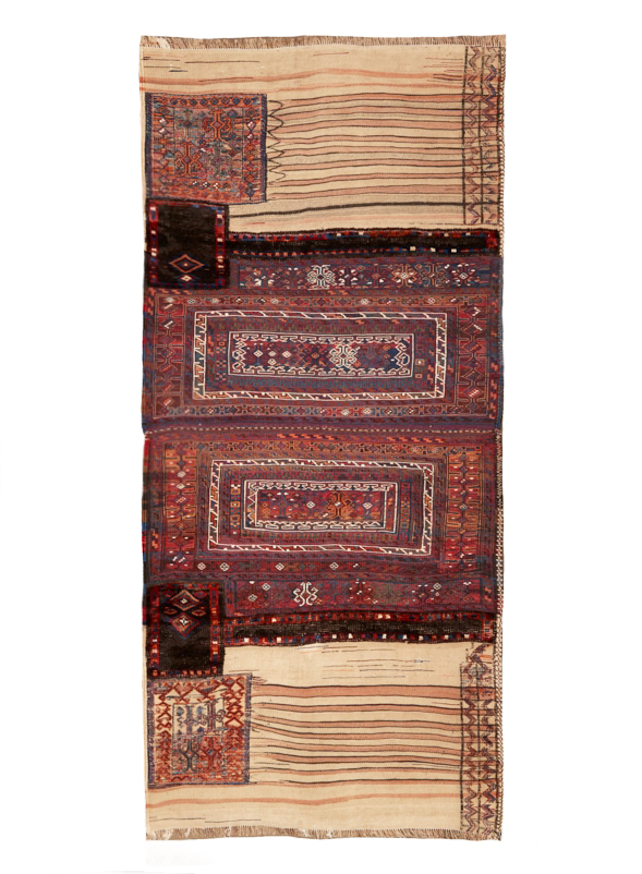 Tacheh: Ce tissage était une grande sacoche servant de valise, décousue et ouverte pour former un rectangle. Tissé à plat sur métier horizontal avec des parties nouées, pour renforcer le tissage et brodées pour créer des motifs en sumac, propres à chaque tribu.