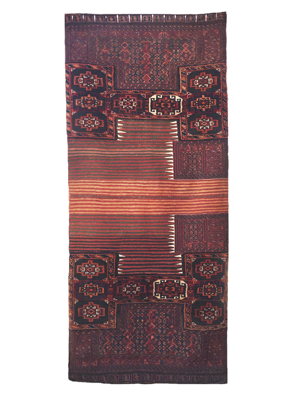 Tacheh: Ce tissage était une grande sacoche servant de valise, décousue et ouverte pour former un rectangle. Tissé à plat sur métier horizontal avec des parties nouées, pour renforcer le tissage et brodées pour créer des motifs en sumac, propres à chaque tribu.