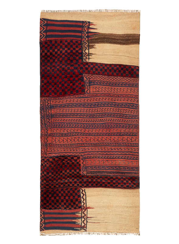 Tacheh: Ce tissage était une grande sacoche servant de valise, décousue et ouverte pour former un rectangle. Tissé à plat sur métier horizontal avec des parties nouées, pour renforcer le tissage et brodées pour créer des motifs en sumac, propres à chaque tribu.