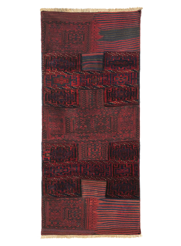 Tacheh: Ce tissage était une grande sacoche servant de valise, décousue et ouverte pour former un rectangle. Tissé à plat sur métier horizontal avec des parties nouées, pour renforcer le tissage et brodées pour créer des motifs en sumac, propres à chaque tribu.