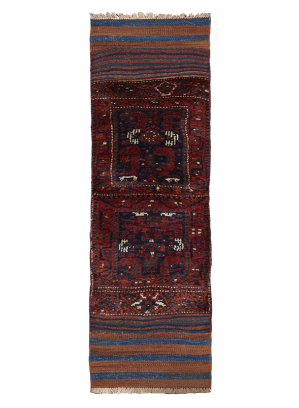 Khorgin: Le mot signifie « petit sac ». Ce type de sac servait à transporter des effets personnels, tissé à plat sur métier horizontal avec des parties nouées selon la technique du tapis, afin de renforcer le tissage et des parties brodées (sumac) pour créer des motifs propres à chaque tribu ; il est ici décousu puis ouvert.