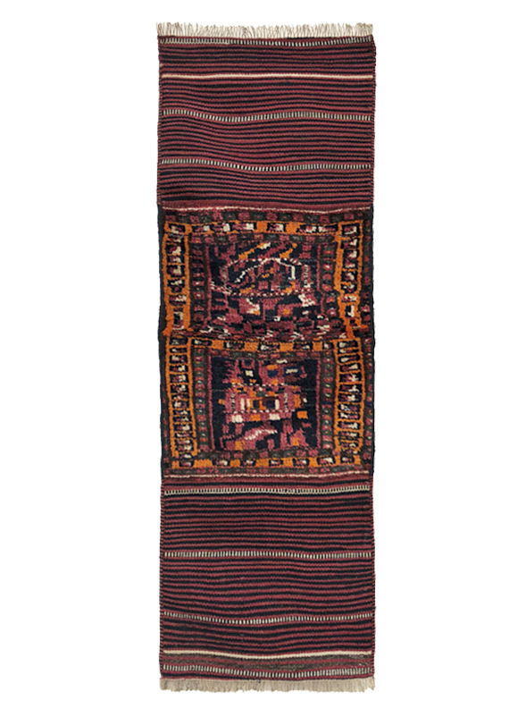 Khorgin: Le mot signifie « petit sac ». Ce type de sac servait à transporter des effets personnels, tissé à plat sur métier horizontal avec des parties nouées selon la technique du tapis, afin de renforcer le tissage et des parties brodées (sumac) pour créer des motifs propres à chaque tribu ; il est ici décousu puis ouvert.